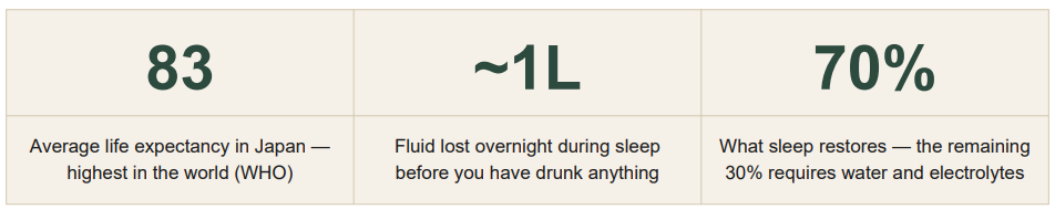 Here is the central fact that makes the Japanese morning ritual more than tradition: everyone wakes up dehydrated. You lose approximately one litre of fluid every night through breathing, perspiration, and the metabolic processes your body never pauses. Sleep restores memory consolidation, cellular repair, and hormonal reset but it cannot replace fluid and electrolytes. That is its ceiling.